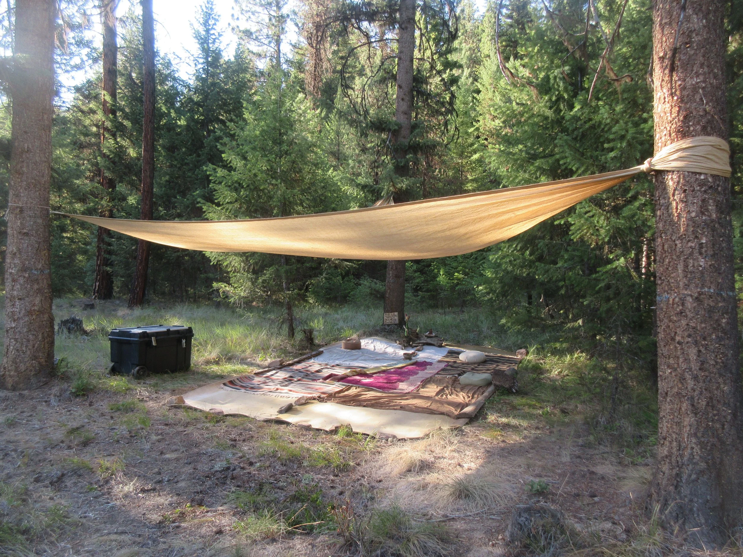 One of the experiments we are running during our retreats is an optional self-guided morning movement session before I sound the outdoor wake up bell to rouse folks from slumber. From 6:00-6:30am, folks can join me by the campfire to move & stretch if and as they like. I have gentle electronic or instrumental music playing in the background and I set out a ground covering so folks can be on the ground without getting dirty. The wake up bell is sounded at 6:30, and our sitting meditation session starts at 7am.