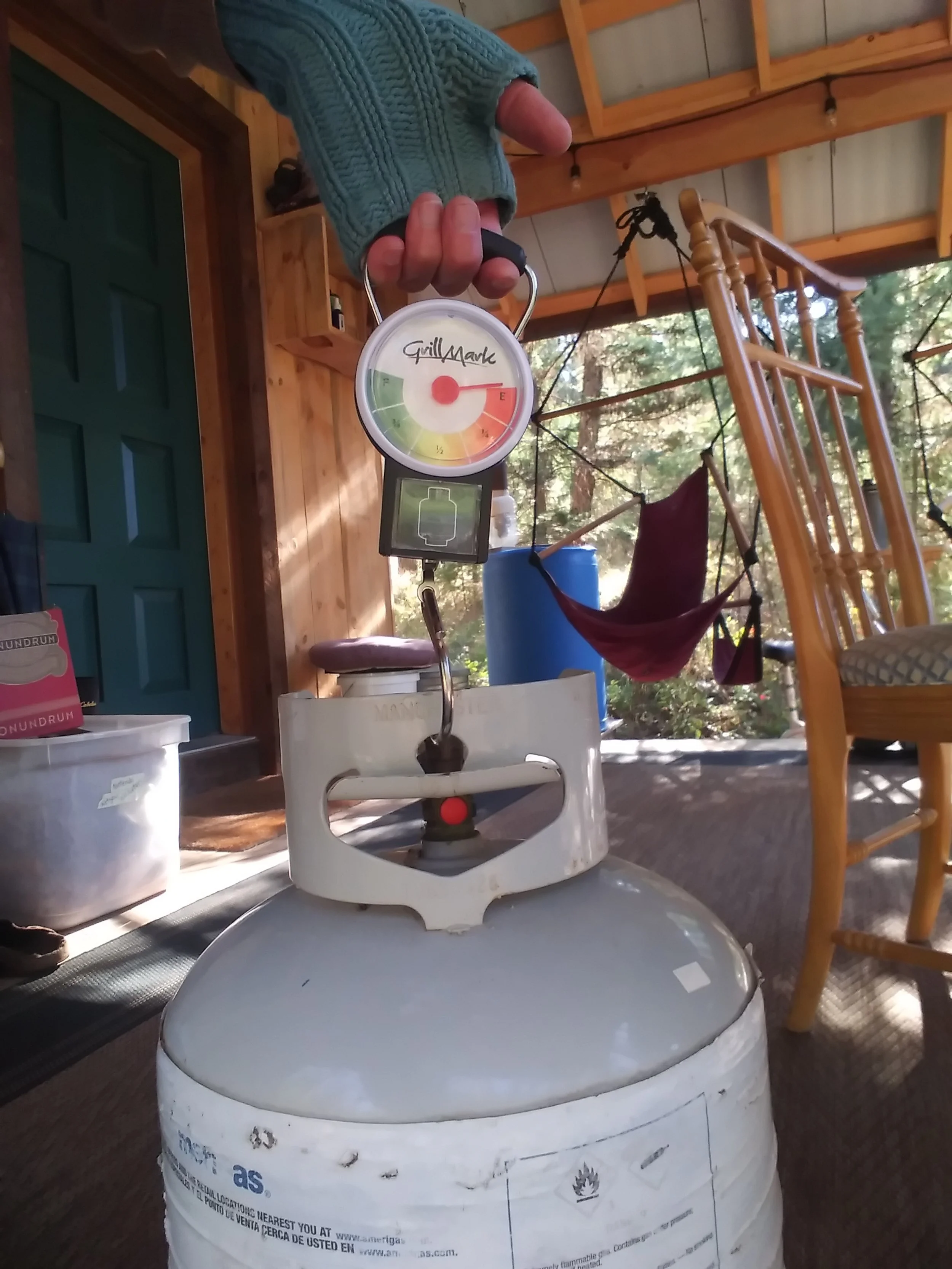 The other day I filled a bunch of smaller 1-lb propane bottles that we use on our cook stove in the cabin from this larger 20-lb tank; this handheld tank scale is such a help, sometimes simple tech is best