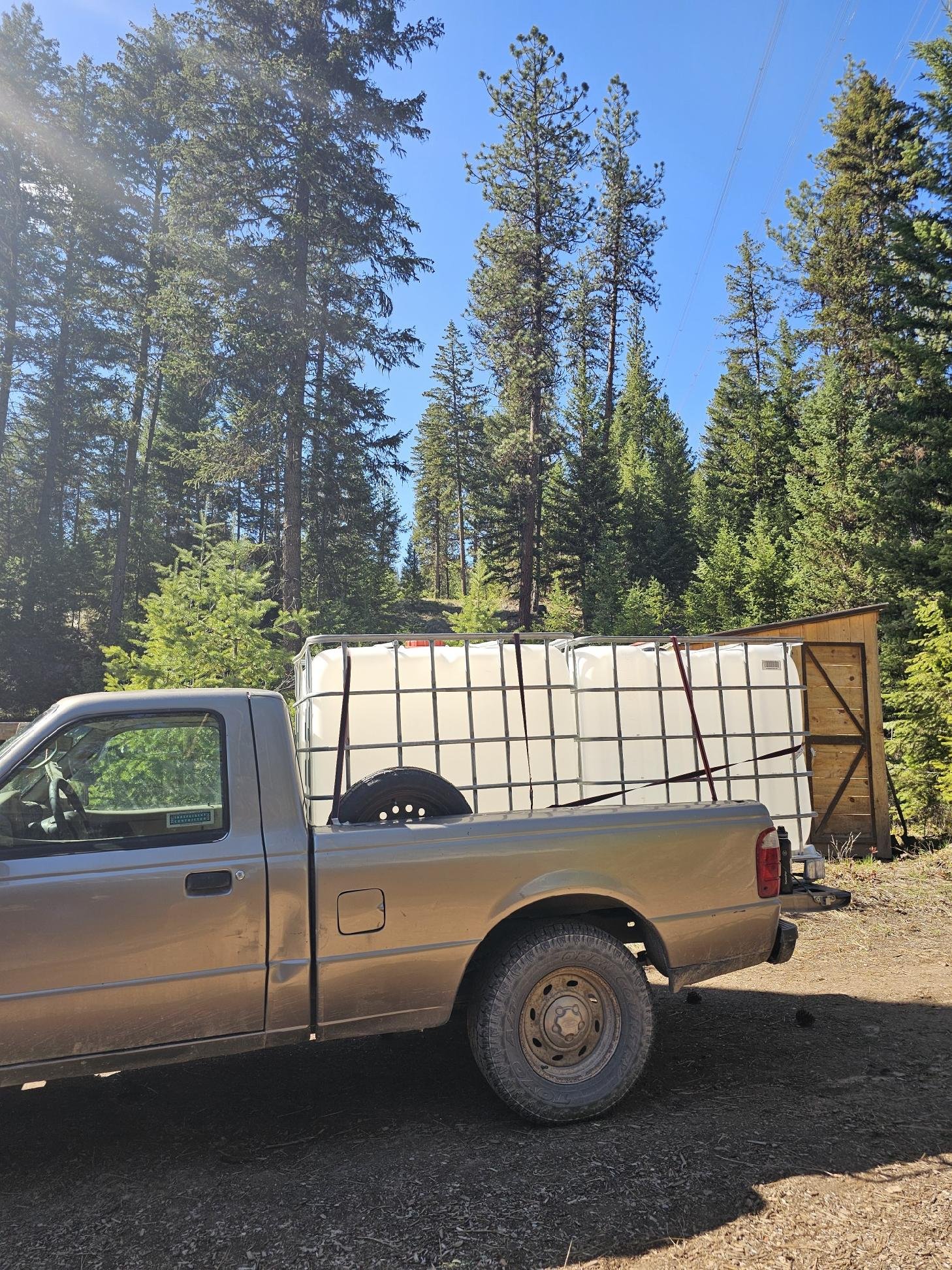 We recently purchased two used water cubes that were on sale for a good price from a man who lived 2.5 hours away. Each cube stores 275 gallons. Currently, and for the past two years, we’ve been operating with three 55 gallon barrels, for a total of 165 gallons of water storage. So once we get these two new cubes up and rolling we’ll be upping our capacity substantially. Our plan is to purchase a tabletop filter we have our eye on and then filter the rain water we collect for cooking & drinking, which would then bring to an end our need to haul potable water from town. We don’t collect enough water to meet all of our water needs at present, so these two new cubes will potentially be a bit of a game changer.